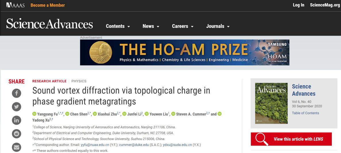 近日,理学院应用物理系伏洋洋副研究员和刘友文教授与美国杜克大学的S. A. Cummer教授以及苏州大学的徐亚东教授合作,在声学轨道角动量研究方面取得重要进展,提出利用相位渐变超构光栅实现操控声学轨道角动量的新机制:声涡旋衍射机制。研究团队设计并实验上验证了一种不对称声涡旋传输器件,该器件在基于声学轨道角动量通信方面具有极大的应用价值。相关成果以 “Sound vortex diffraction via topological charge in phase gradient metagratings”为题发表在Science子刊《Science Advances》杂志上。伏洋洋副研究员为论文的共同通讯作者和第一作者,杜克大学的Cummer教授和苏州大学的徐亚东教授为论文的共同通讯作者。
