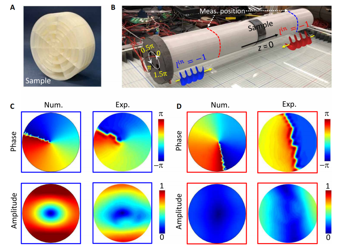 的声涡旋从左侧(C)和右侧(D)入射数值模拟和实验测量的透射相位和振幅;