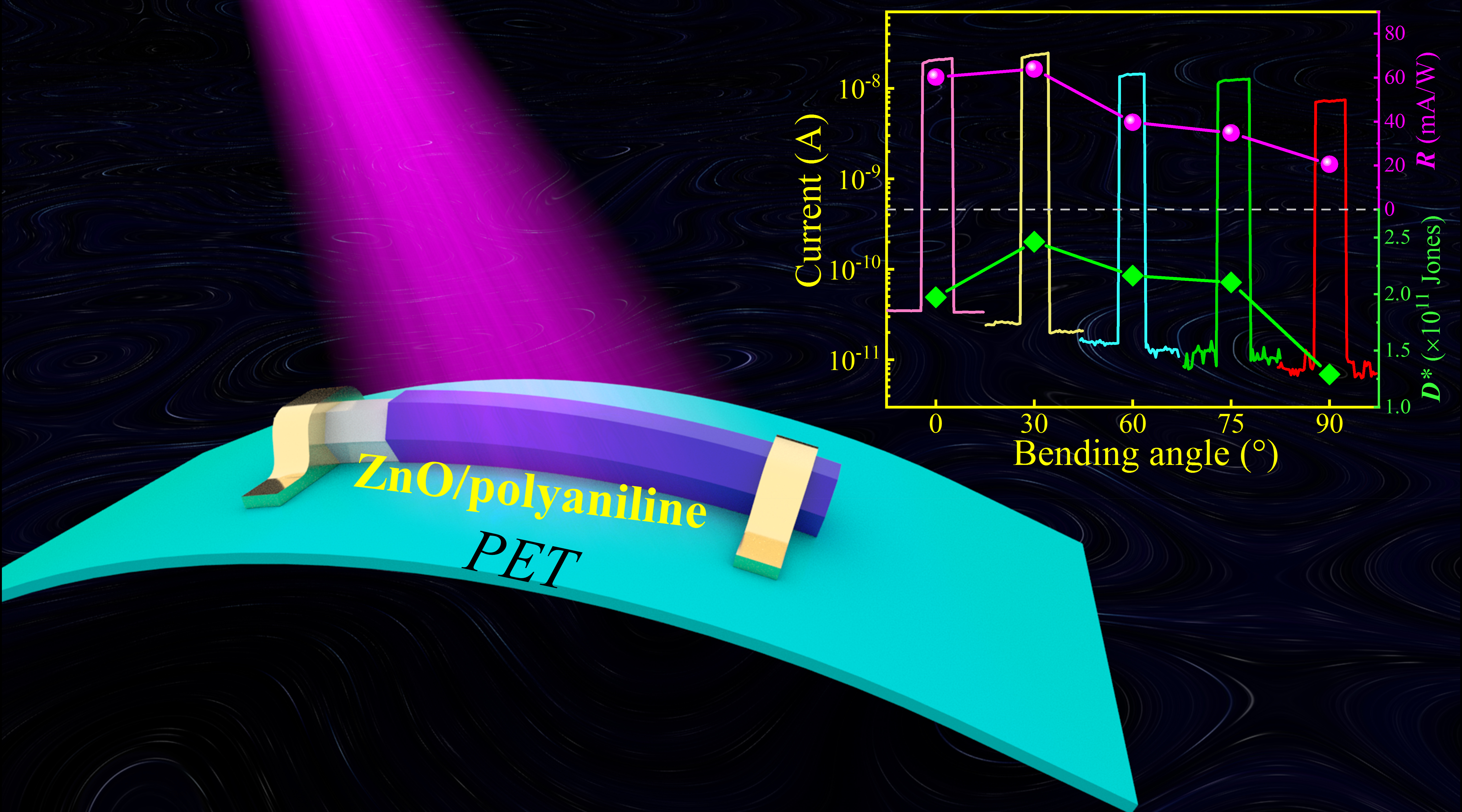 本研究工作依托阚彩侠教授课题组(光电功能材料、器件与物理课题组)平台,在实验上采用化学气相输运沉积实验方法合成了高结晶质量的ZnO微米线,并结合聚苯胺材料构筑了有机/无机杂化异质结柔性紫外光电探测器。由于合成的ZnO具有高结晶质量,空间电荷区内载流子的有效分离以及表面氧缺陷的钝化,器件在-1 V反向偏压下表现出高性能(响应率~60 mA/W, 比探测率∼2.0 ×1011 Jones)。该柔性紫外光电探测器响应/恢复时间短(~0.44 s/0.42 s),这种紫外光电探测器在弯曲的条件下表现出很高的稳定性和重复性。实验结果为设计结构简单、低成本、高性能的功能型柔性紫外探测器提供一种可行方案,在导弹预警、火灾监控、通信通讯、医疗保健等领域有着广阔的应用前景。