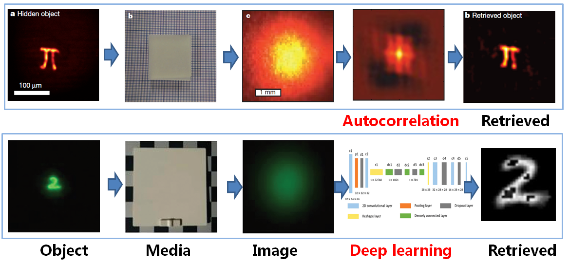 计算光学成像是一个新兴学科,该学科结合光学技术、计算机技术和数字图像处理技术以达到更高性能的光学成像质量。结合统计光学原理和深度学习方法,进一步可解决目标从“看不见”到“看得见”的问题,如卫星穿过大气层对地探测、地基探测器穿过浓雾对远处目标探测、潜艇穿过浑浊的水对目标探测等。除了散射成像外,计算光学成像还包括鬼成像、数字全息相位成像、非视域成像、超分辨成像等,计算成像技术不但解决了许多过去成像领域难以解决的问题,还在信息获取能力、成像的功能、核心性能指标,例如空间分辨率、时间分辨率、灵敏度等获得了显著提升。