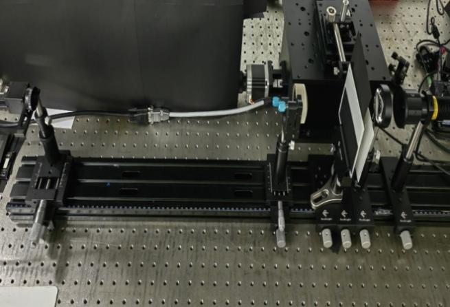 采用非相干光照明模式,将激光照射空间到空间光调制器(SLM)上,计算机控制空间光调制器的相位以此显示目标物体,物体反射光通过分束镜传播到达散射介质,同时计算机控制CCD捕获透过散射介质的散斑图案。捕获的散斑图案经过后续软件处理输入到神经网络进行模型训练,训练好的模型能够对隐藏在散射介质后面的物体进行图像复原。该课题主要应用到遥感成像和生物医学等领域。