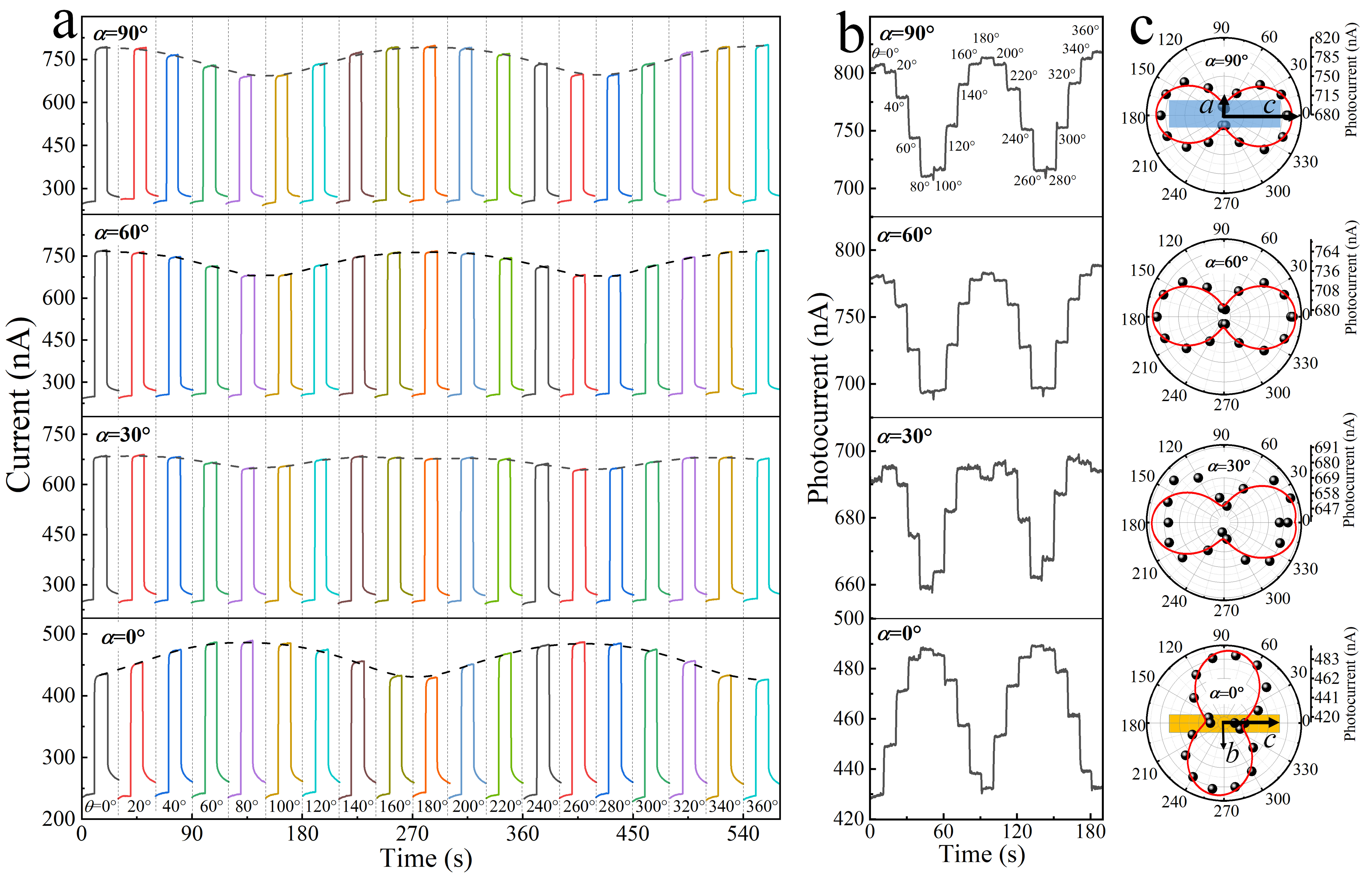 Sb2Se3微米带探测器进行偏振光电流测试,其中宽侧面和窄侧面均作为辐照面。如图2所示,基于Sb2Se3微米带的偏振探测器,从宽辐照面到窄辐照面,偏振敏感性有明显的垂直反转。各向异性比从1.18逐渐降低为0.87。根据有限元分析,一维几何形态的各向异性不是Sb2Se3微米带偏振敏感性的原因。基于第一性原理计算,垂直反转的偏振敏感性来源于晶体结构各向异性引起的光学各向异性。
