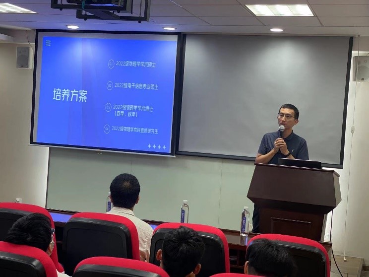 在研究生朋辈经验交流环节,物理学专业2018级博士生、2021年国家奖学金获得者徐娟面向新生作经验交流分享,结合自己的求学经历向学弟学妹们传授了科研学习经验,建议大家要做好时间管理,制定研究计划。电子信息专业2021级硕士生张振向新生介绍了自己对本专业的学习体会。他鼓励学弟学妹们要立志专心科研,在未来的研究生时光里有所成长、有所成就。