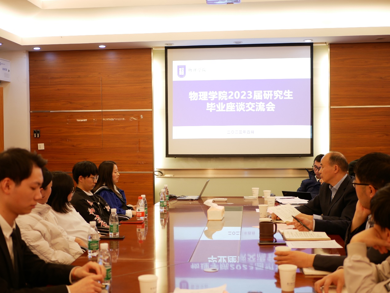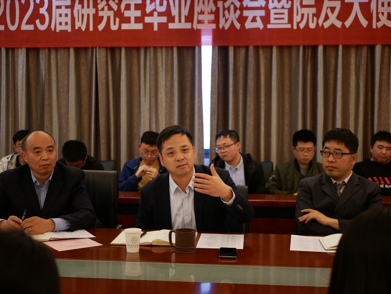 辅导员向到场的学院领导及研究生教育管理工作组成员介绍了2023届毕业生基本信息、就业升学去向等相关情况。全体毕业生畅所欲言,依次分享了各自在校期间的学习经历与成长体验,并围绕人才培养、教学科研、设施改善等方面提出了大量具有建设性的意见和建议,同时也表达了对学院的衷心感谢及美好祝愿。