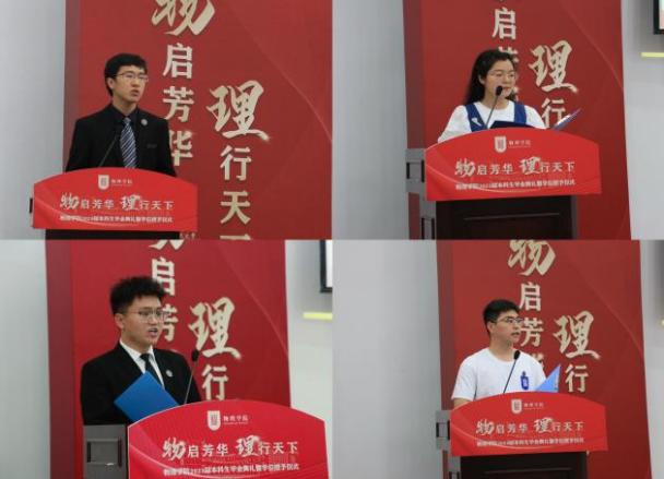 毕业典礼上,四名毕业生代表上台分享自己的成长奋斗经历。保研至中国科学院大学理论物理研究所的王家祺,从参加科创、竞赛,担任物理爱好者协会会长的经历出发,讲述了自己在师友的帮助下一路追梦的故事;直博本院的张钰皓用担任院青协主席、参与社会实践的经历证明,学霸也有多彩的大学生活;顺利就业的冯宇昊分享自己从大二开始的求职就业路,告诉大家机会是留给有准备的人的;高文达分享了自己从留级边缘到绩点3.6,最后成功考研本校成功逆袭的故事,鼓励学弟学妹们永不放弃、砥砺前行。