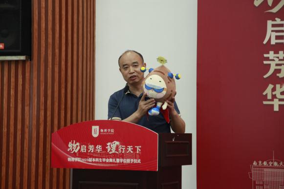 刘友文点赞同学们的“小粒子”设计并寄语毕业生,他指出,大学四年对物理一点一滴的探索赋予了同学们格物致知的品格,这将让人受益终身,希望每位同学都能带着南航人的自信、物理人的智慧,奔赴四方、开启新篇!