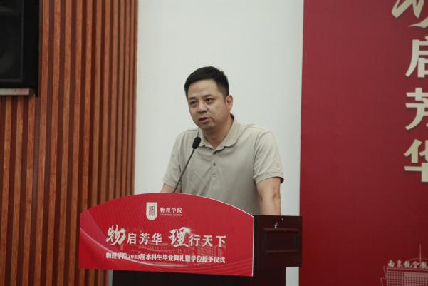 619日下午,必威BETWAY西汉姆联“物启芳华,理行天下”2023届本科生毕业典礼暨学位授予仪式于理学楼报告厅举行。必威BETWAY西汉姆联党委书记陈修文、院长刘友文、党委副书记欧珊、副院长阎志军、学院党委委员、院长助理、各系、中心主任、专业老师以及2023届全体毕业生出席典礼。为充分发挥典礼的育人效果,学院低年级全体本科生也参加了本次典礼,聆听优秀学长学姐的故事分享。典礼由毕业生陈豪杰、江淼主持。