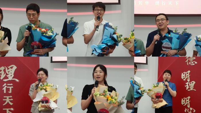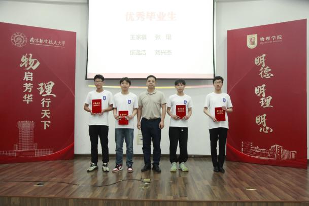 毕业典礼上,四名毕业生代表上台分享自己的成长奋斗经历。保研至中国科学院大学理论物理研究所的王家祺,从参加科创、竞赛,担任物理爱好者协会会长的经历出发,讲述了自己在师友的帮助下一路追梦的故事;直博本院的张钰皓用担任院青协主席、参与社会实践的经历证明,学霸也有多彩的大学生活;顺利就业的冯宇昊分享自己从大二开始的求职就业路,告诉大家机会是留给有准备的人的;高文达分享了自己从留级边缘到绩点3.6,最后成功考研本校成功逆袭的故事,鼓励学弟学妹们永不放弃、砥砺前行。