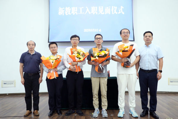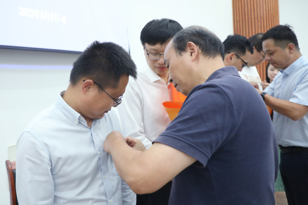 首先,大会举行了新教师见面仪式,由陈修文、刘友文为新教师佩戴院徽并送上鲜花。