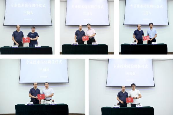 在学院岗位聘任仪式上,刘友文介绍了学校本轮岗位考核和聘任的指导思想、原则和特点。专业技术三岗A、三岗B、四岗、五岗的老师分别上台签署岗位聘书,并合影留念。