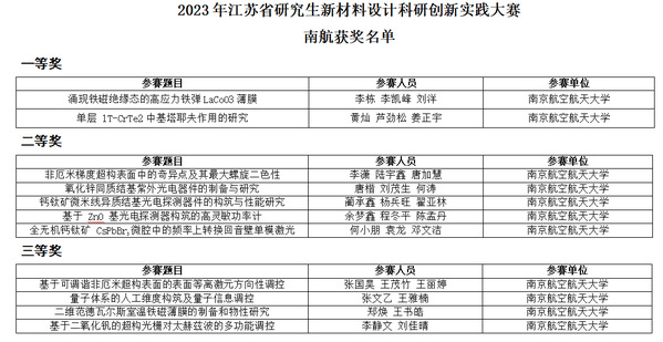 11月03日-11月05日,由江苏省学位办委托江苏省理学1类研究生教育指导委员会主办,江苏省物理学会和江苏省材料学会指导,苏州科技大学物理科学与技术学院承办,苏州大学物理科学与技术学院联办的“2023年江苏省研究生新材料设计科研创新实践大赛”成功在苏州举办。我院教师积极指导学生参赛,共获得一等奖2项,二等奖5项,三等奖4项。