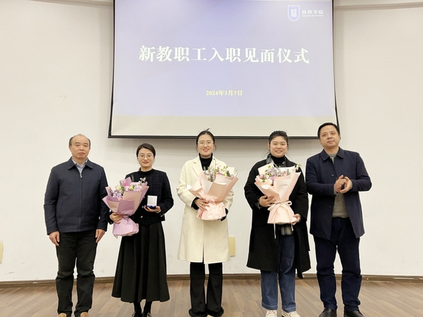 会议还举行了新教职工入职见面仪式,对薛涵、李爽、耿甜甜等三名新教师入职学院表示热烈欢迎,陈修文、刘友文为她们佩戴院徽,并送上鲜花。
