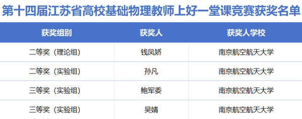 近日,我院教师在“第十四届江苏省高校基础物理教师上好一堂课竞赛”“2024年江苏省高等学校微课教学比赛”等省级教学竞赛中喜讯频传。