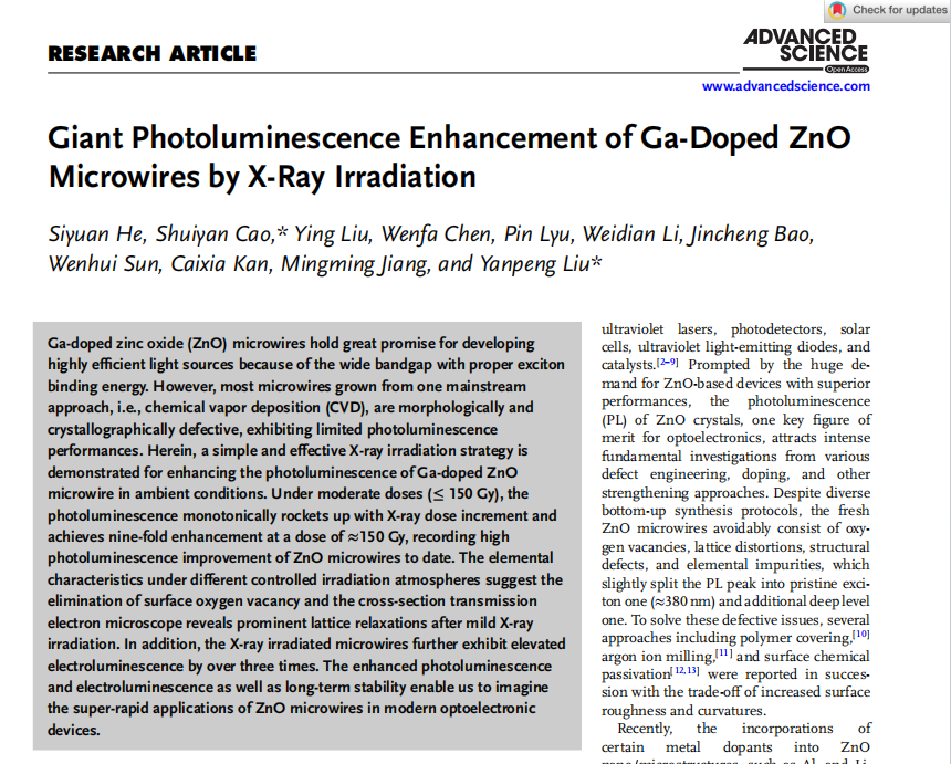 相关成果以“Giant Photoluminescence Enhancement of Ga-Doped ZnO Microwires by X-Ray Irradiation”为题在线发表在《Advanced Science》(中科院SCI一区TOP)。电子信息专业硕士生何思远为第一作者,曹水艳副研究员为通讯作者,国际前沿科学研究院刘衍朋教授为共同通讯作者。