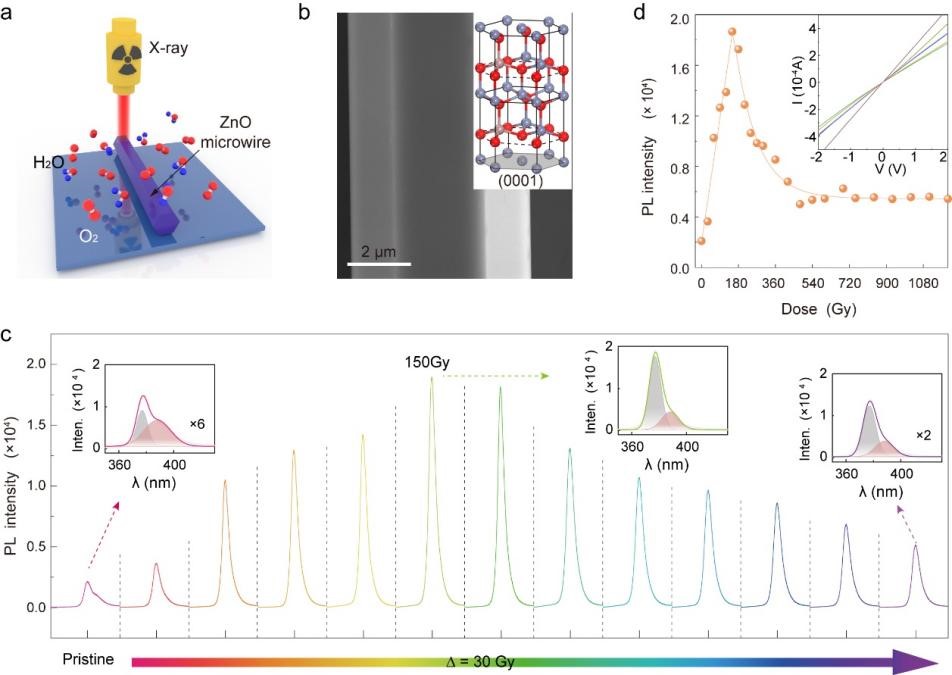 必威BETWAY西汉姆联光电功能材料器件与物理研究团队曹水艳副研究员与国际前沿科学研究院刘衍朋教授合作,研究了Ga掺杂ZnO微米线在X射线辐照环境下的光电特性,结果表明在150Gy的辐照剂量下,可以实现单根微米线9倍的光致发光增强,通过不同氛围下辐照的微米线的X射线光电子能谱(XPS)并结合DFT的理论计算,解释了光致发光的增强是由于材料表面氧空位的减少和晶格的弛豫。