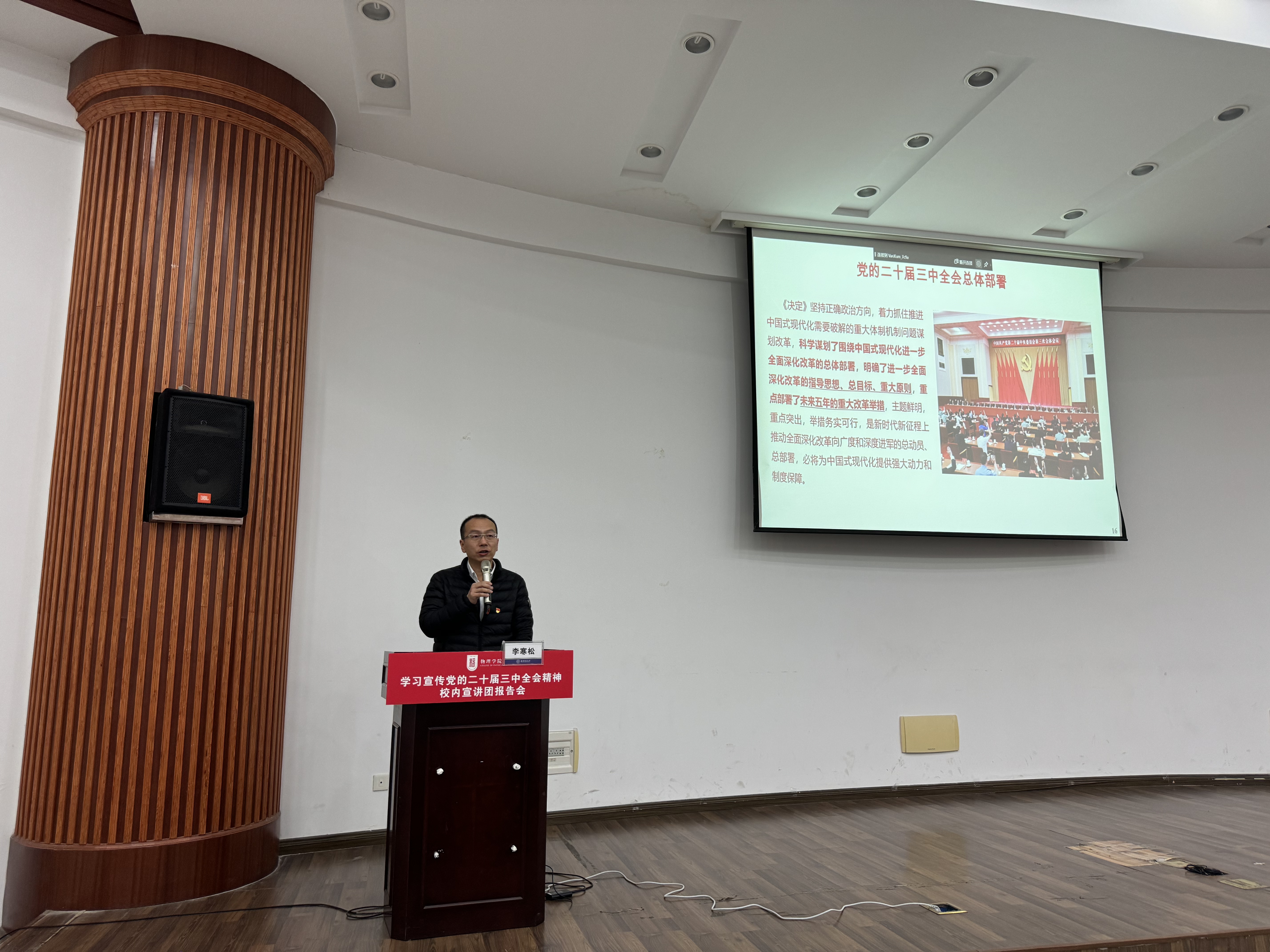 为深入学习贯彻党的二十届三中全会精神,根据校党委统一部署,11月27日,必威BETWAY西汉姆联举行学习宣传党的二十届三中全会精神校内宣讲团报告会,邀请校内宣讲团成员、机电学院教授李寒松作专题辅导报告。学院领导班子成员、全体师生党员、积极分子参加报告会,报告会由学院副院长阚彩侠主持。