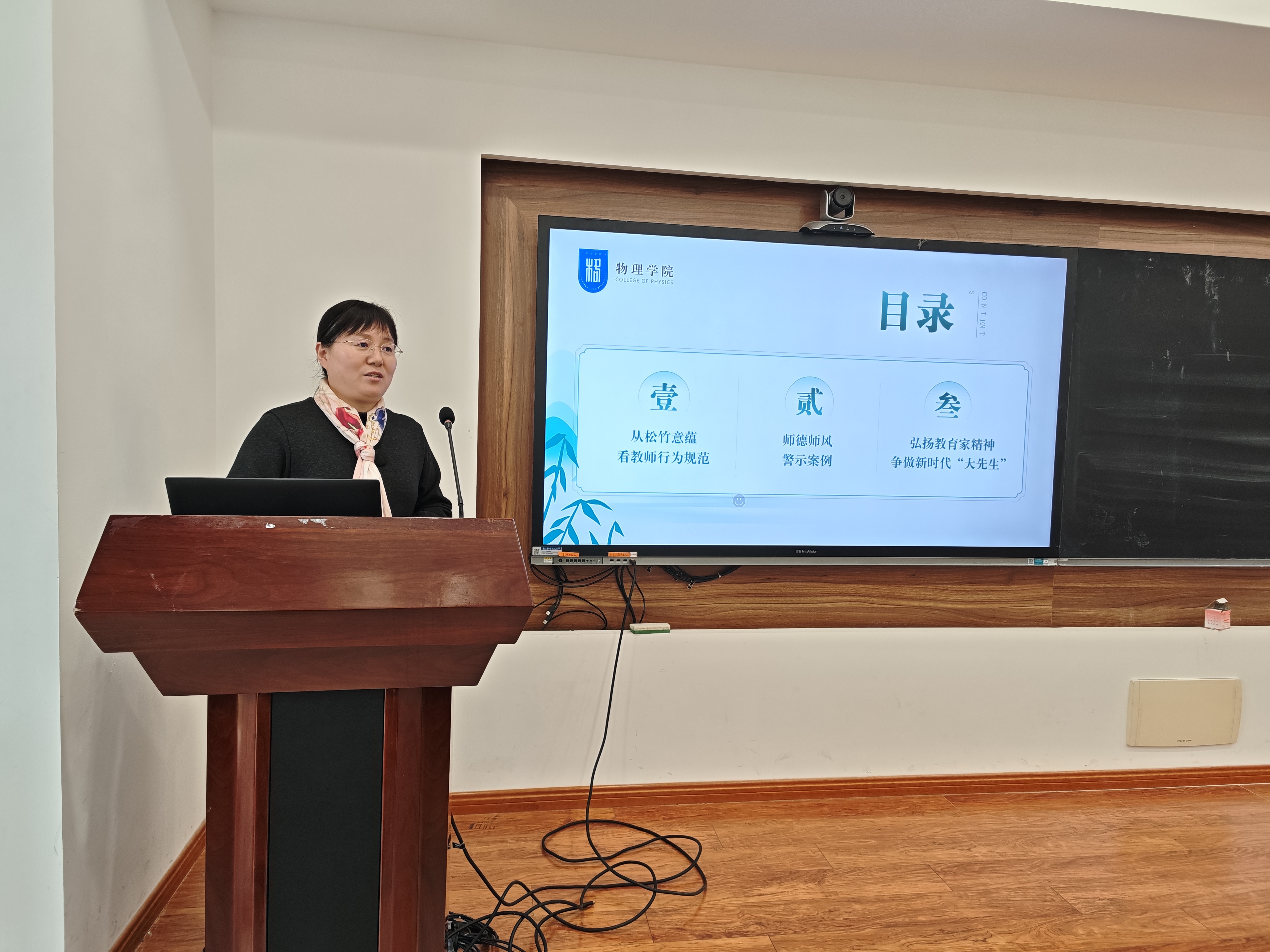 首先,阚彩侠以《廉洁从教·师者风范》为题为大家讲授了专题党课,围绕“从松竹意蕴看教师行为规范”“师德师风警示案例剖析”“弘扬教育家精神,争做时代‘大先生’”三个部分,为在场师生带来深刻的思想淬炼与精神洗礼。教师是学生德行的标杆,支部纪检委员要切实履行监督职责,常态化开展师德师风警示教育。全体教师要以松竹为镜,把“正直守节、清廉自律”的要求融入教育教学、科研立项、职称评聘等各项工作,时刻绷紧纪律之弦,坚决守住师德底线;要以张桂梅、黄大年等先进典型为榜样,将教书育人与自我修养相结合,做“经师”与“人师”相统一的新时代“大先生”。