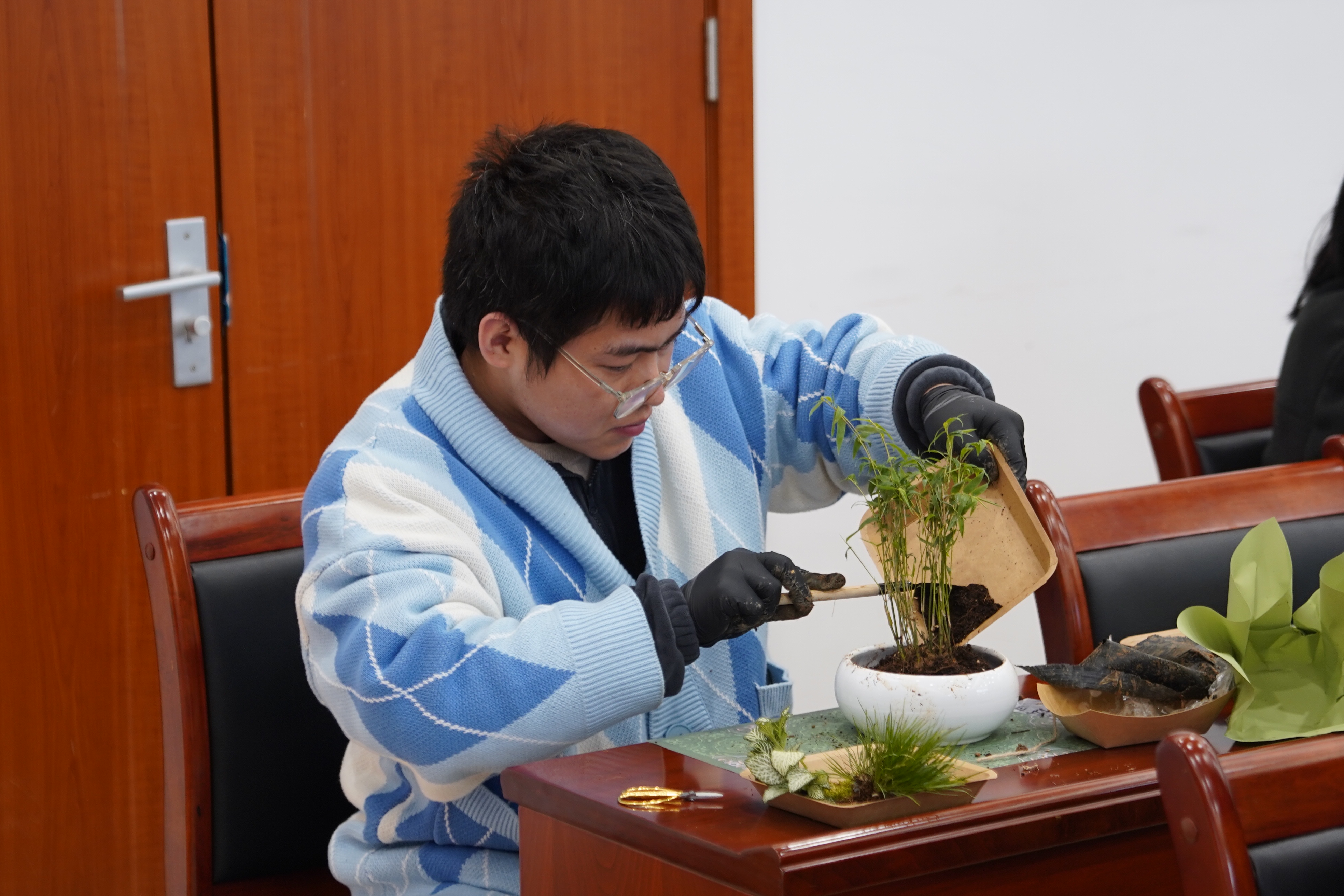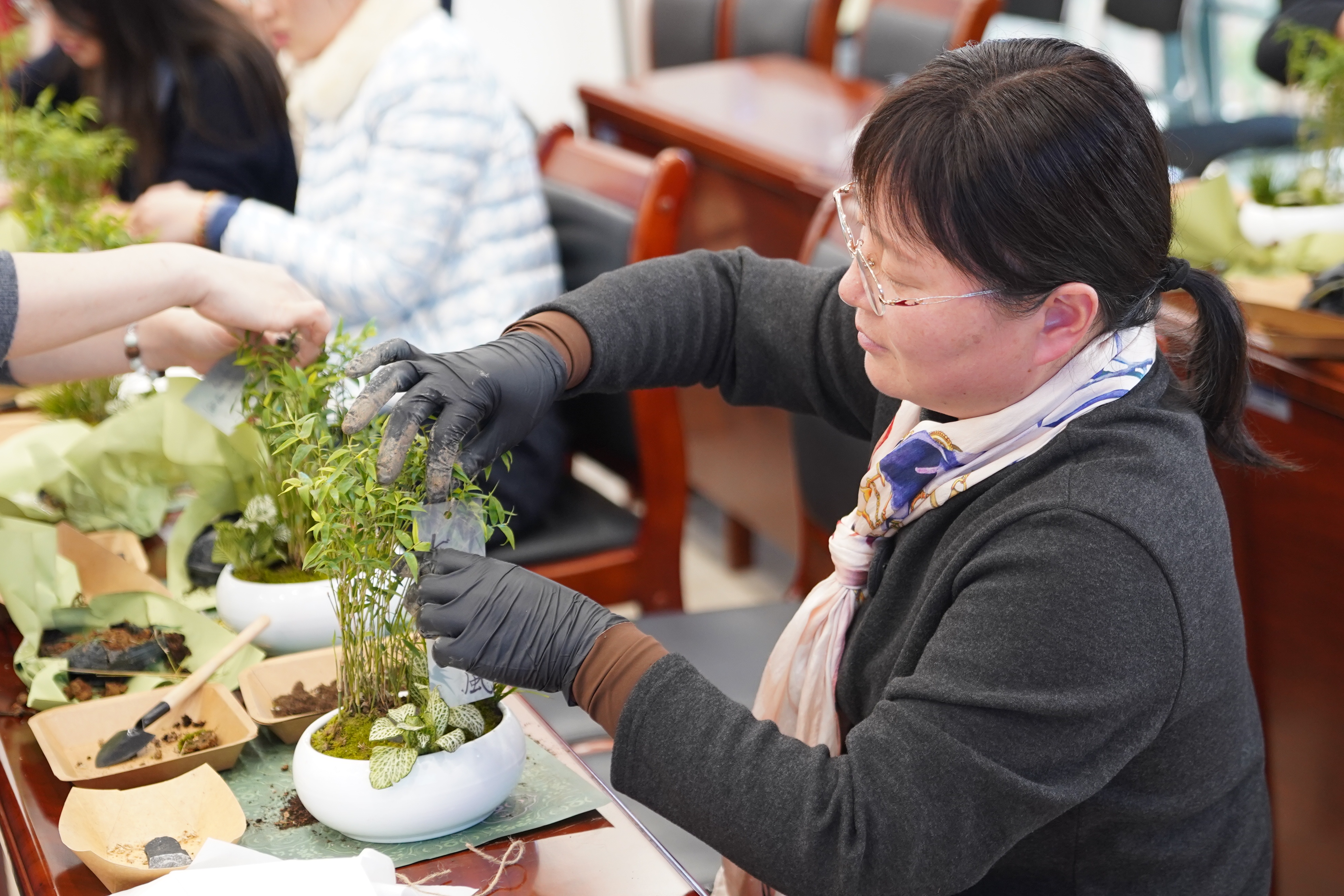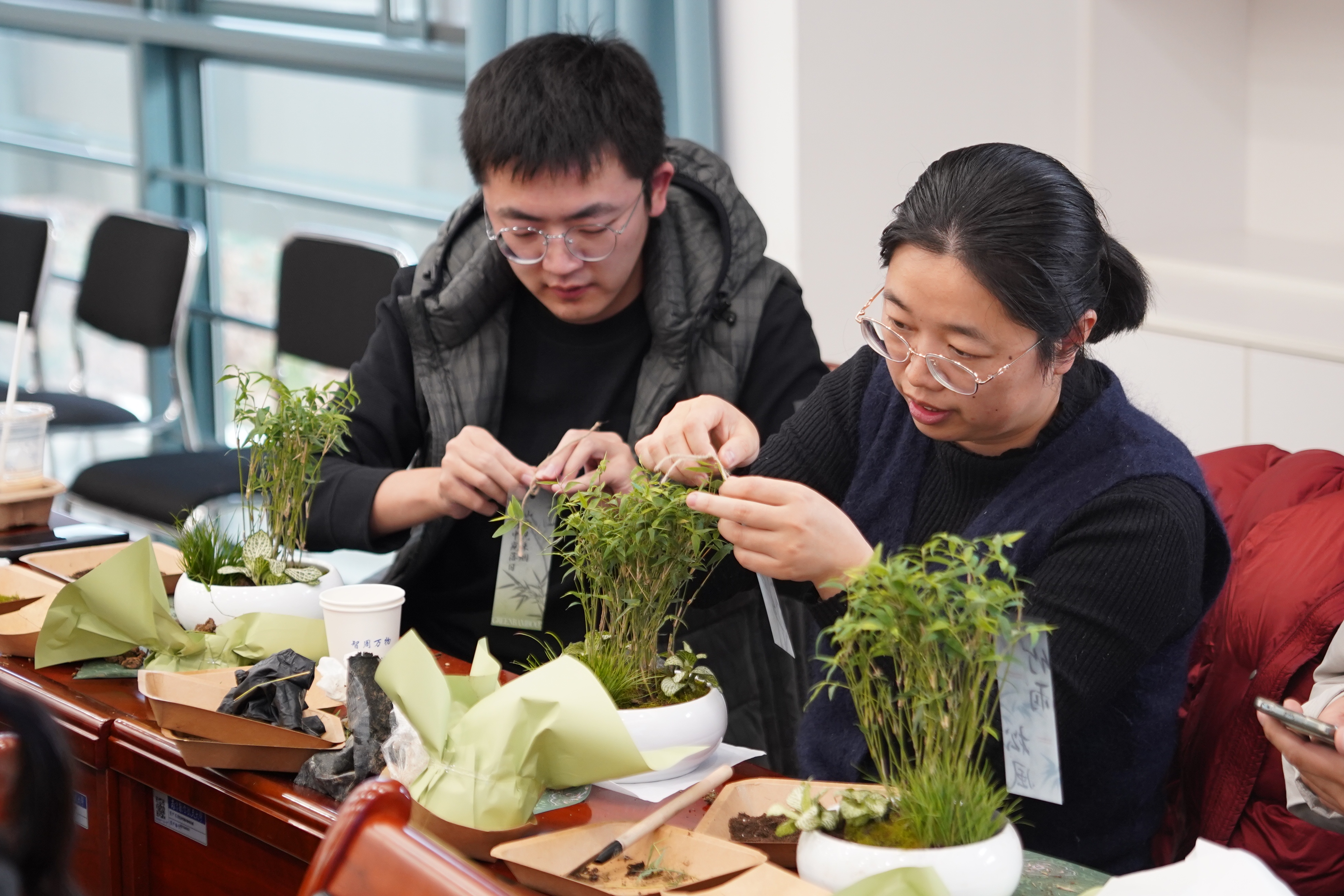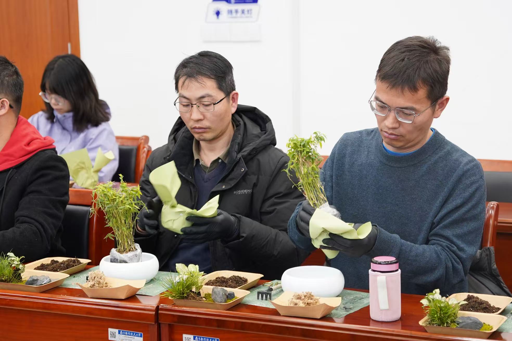 党课结束后,进入“竹韵清风・廉心手作”实践环节。学院创新采用中式绿植手作形式,精心准备青龙石、鲜竹枝、苔藓等造景材料,将廉洁教育与传统美学有机结合。参与活动的教职工专注投入创作,从材料选择到景观布局,深度挖掘竹子“外直中空、清影坚韧”的廉洁文化内涵,完成了兼具艺术价值与教育意义的清廉主题绿植盆栽作品。实践环节通过沉浸式体验,让廉洁理念在实践操作中入脑入心,切实达到了“以手作悟廉道、以绿植润初心”的教育目标。