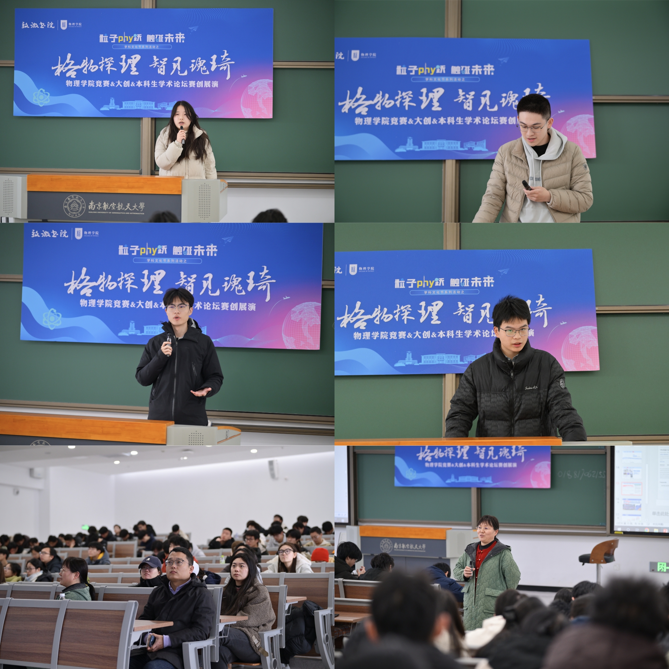 分享环节,中国大学生物理学术竞赛/全国大学生物理实验竞赛获奖学生代表、本科生学术论坛一等奖获奖学生代表、国家级/省级优秀大创项目负责人依次登台,带来干货满满的经验分享:通过复盘赛事流程,分享备赛磨合、科研探究等关键经验,引发在场学生强烈共鸣;围绕学术论坛全流程,细致讲解选题策略、论文撰写等核心经验,为学术表达提供针对性指导;结合自身科研经历,剖析项目背景挖掘、创新点提炼等方法,帮助低年级学生建立科创项目开展的逻辑认知,推动跨专业深入探讨。现场围绕技术融合、跨学科应用等热点问题深入交流,互动氛围浓厚、思维碰撞不断。